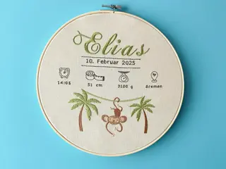 Dieses wunderschöne personalisierte Stickbild verewigt alle wichtigen Daten zur Geburt deines Babys – individuell und mit viel Liebe gefertigt. Der gezeigte Rahmen wird mit dem Namen, dem Geburtsdatum, der Uhrzeit, dem Gewicht, der Größe sowie dem Geburtsort bestickt. Als liebevolles Highlight galoppiert ein detailreich gesticktes Pferd umgeben von zarten Blumenmotiven über den unteren Teil des Rahmens.Ob für dein eigenes Kind oder als unvergessliches Geschenk für frischgebackene Eltern – diese hochwertige Geburtsstickerei ist ein absoluter Blickfang im Kinderzimmer.